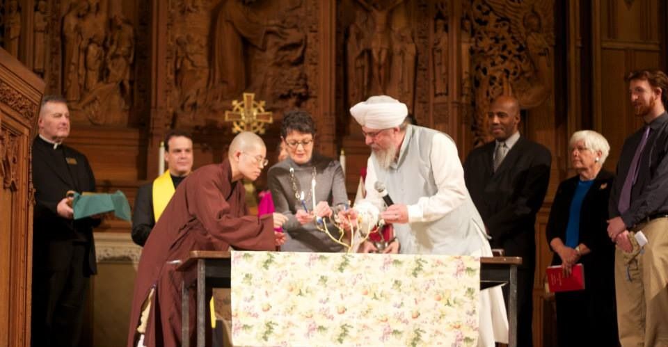 The candles I’d put in the Chanukah menorah fell over. The large Sikh leader – broad, tall, flowing white clothes and silver beard – and the diminutive Buddhist nun – small, dark robed, shaved head – leapt forward together to catch the candles. The Sikh and the Buddhist quickly placed the candles back in the menorah, so that the nice Jewish lady could light them. She then lit the candles and said the prayers, up at the front of the Methodist church, in front of over 300 people from at least eight different faith communities.