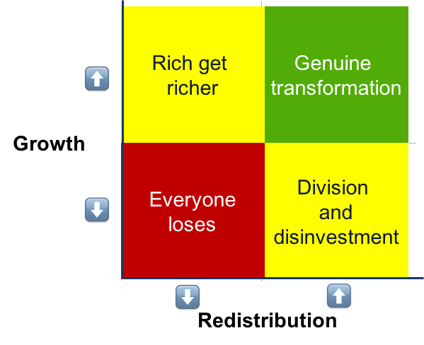 - Redistribution without growth is likely to stall an economy, incurring the costs of disruption without the benefits, and driving away needed investment.